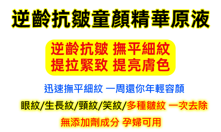 2分鐘前逆齡抗皺童顏精華原液 抵禦初老 嫩回“童顏” 奢潤修養 撫平歲月痕迹 - 【狂殺特賣】四入組$1299(全臉抗皺美白)